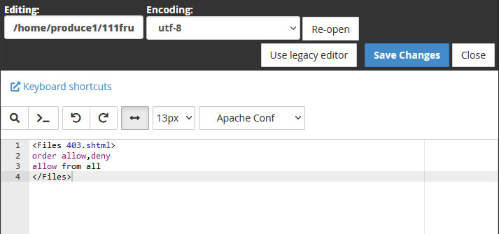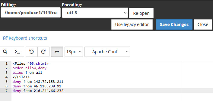 Now, the 403.shtml page will simply stay blank, meaning any blocked IP addresses will see a blank page and have no further access to other locations from here.