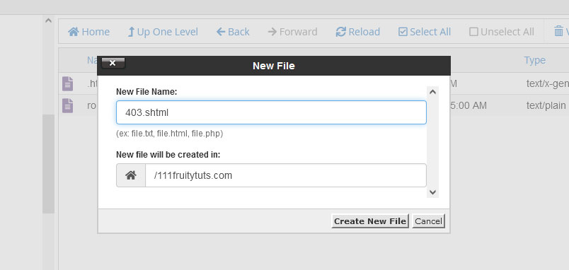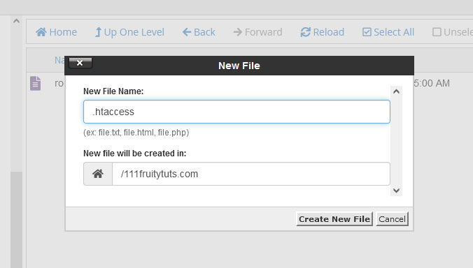 When you type in ".htaccess" you should then select your location below, I have used 111fruityttus.com as a test domain, then click on the "create new file" button.