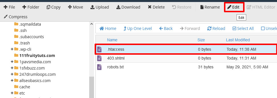 Select ".htaccess" and click on edit at the top (pencil icon before the text edit)