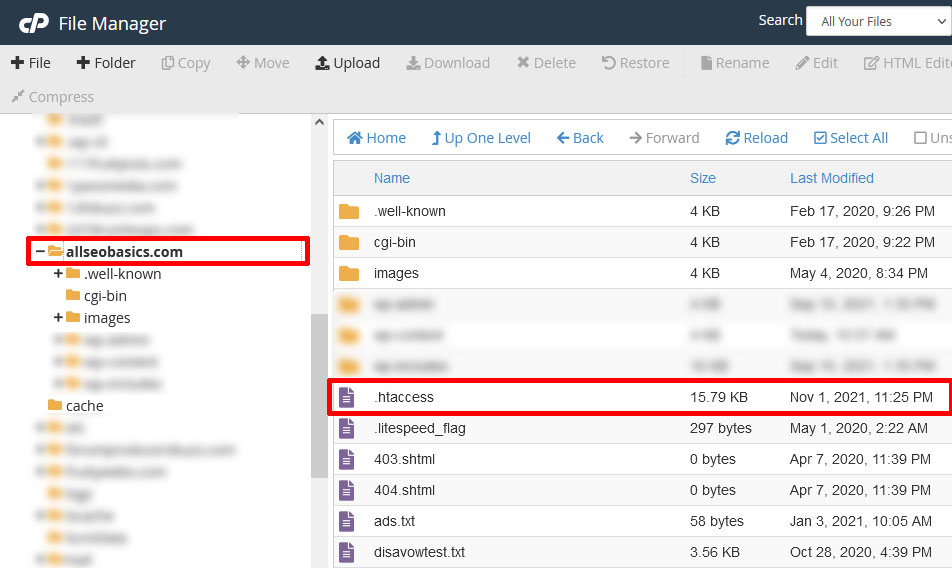 I have blurred out any secure folders and files for security reasons, but as you can see, I have located all SEO basics on our web host and also located the ".htaccess" file.